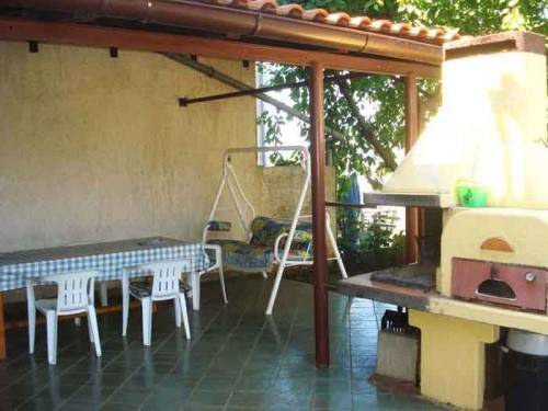 Výhled na velkou zahradu domu, využití kryté terasy s grilem.g Garáže. Dům je 500 metrů od moře a 4 km od centra města Puly.